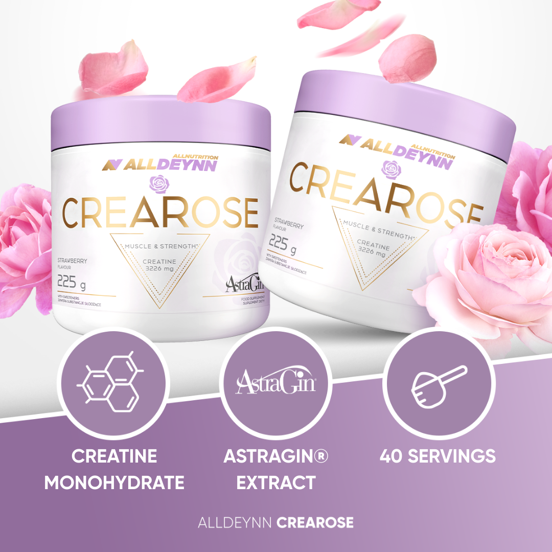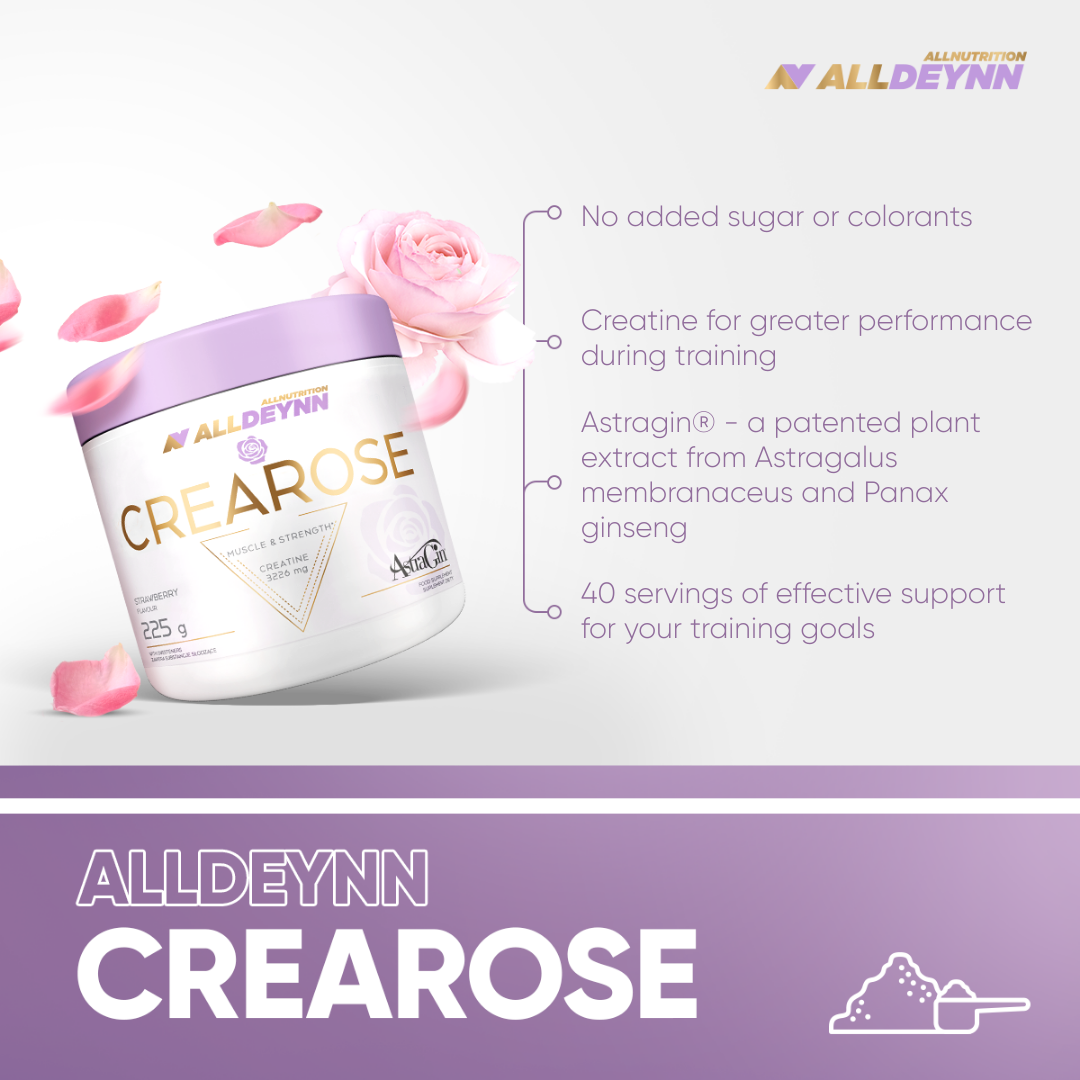 Do you dream of an athletic figure, firm buttocks and a body that radiates energy? ALLDEYNN CREAROSE is a dietary supplement created for women like you – ambitious, active and aware of their femininity. Thanks to the combination of the effectiveness of creatine and the innovative ingredient AstraGin®, it supports you not only in your training but also in achieving your dream figure.