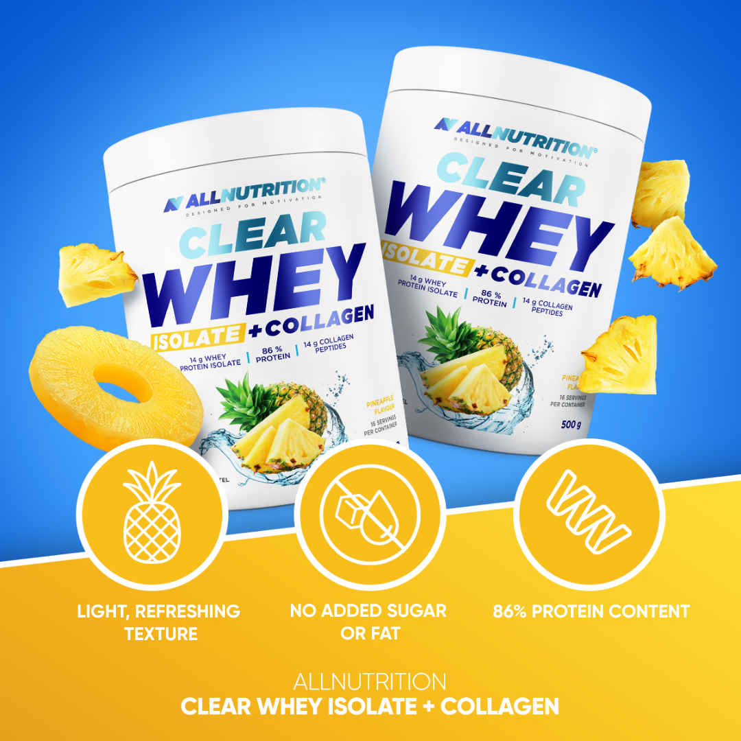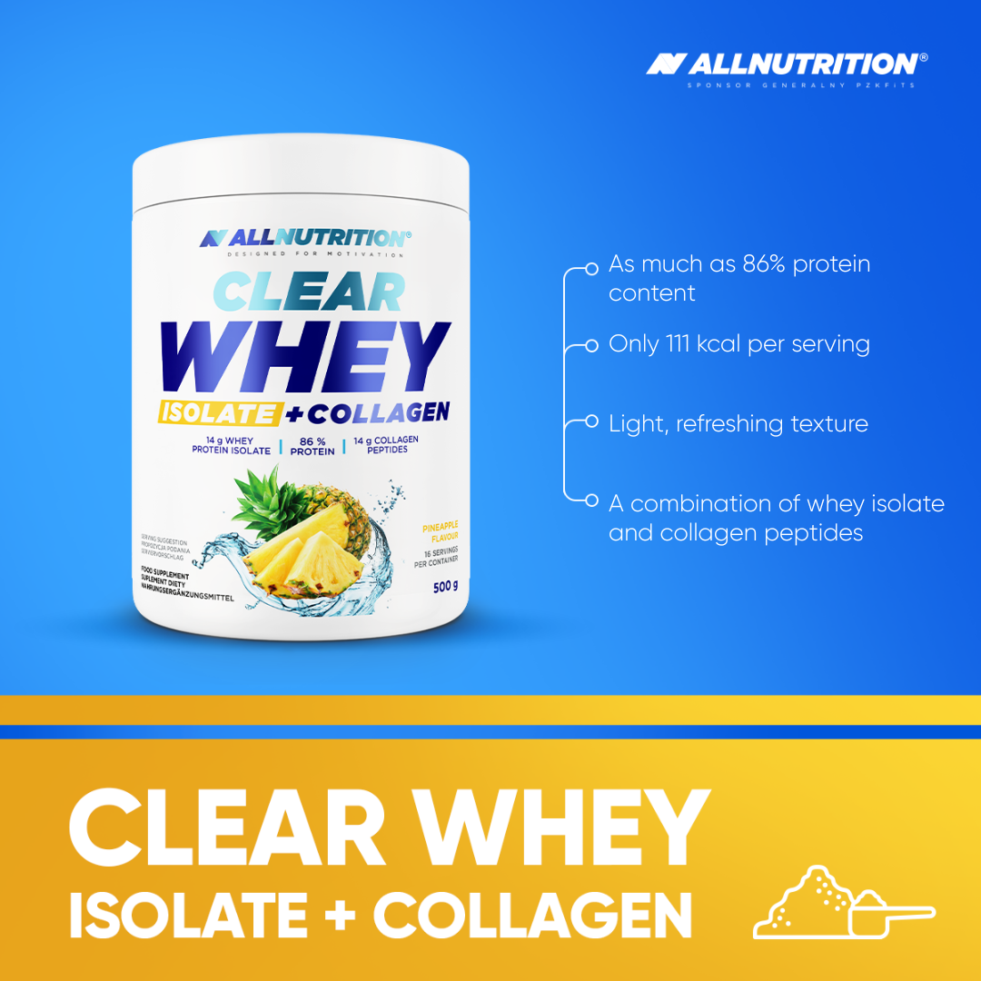 ALLNUTRITION CLEAR WHEY ISOLATE + COLLAGEN is a high-quality dietary supplement in powder form that redefines the approach to protein supplements. Forget thick, milky shakes! When mixed with water, this product turns into a delicious, delicate drink with a fruity taste. Thanks to the unique combination of whey protein isolate (WPI) and hydrolysed collagen, it delivers a powerful dose of protein to your body, supporting your physique goals.