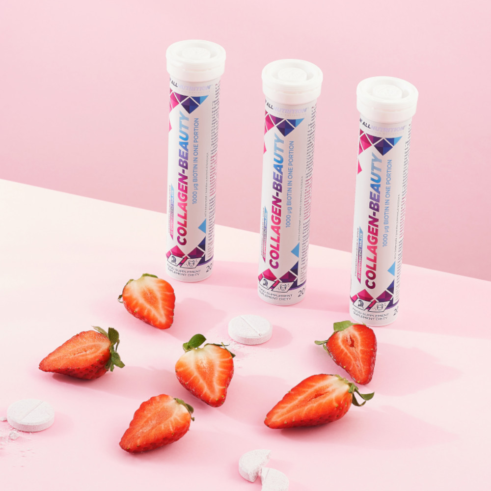 ALLNUTRITION COLLAGEN - BEAUTY is a dietary supplement in the form of strawberry and rhubarb-flavoured effervescent tablets that combine hydrolysed fish collagen with a complex of essential vitamins and minerals. It is designed for people who care about their health, regeneration and beauty, and for anyone who wants to take comprehensive care of their body from the inside out.