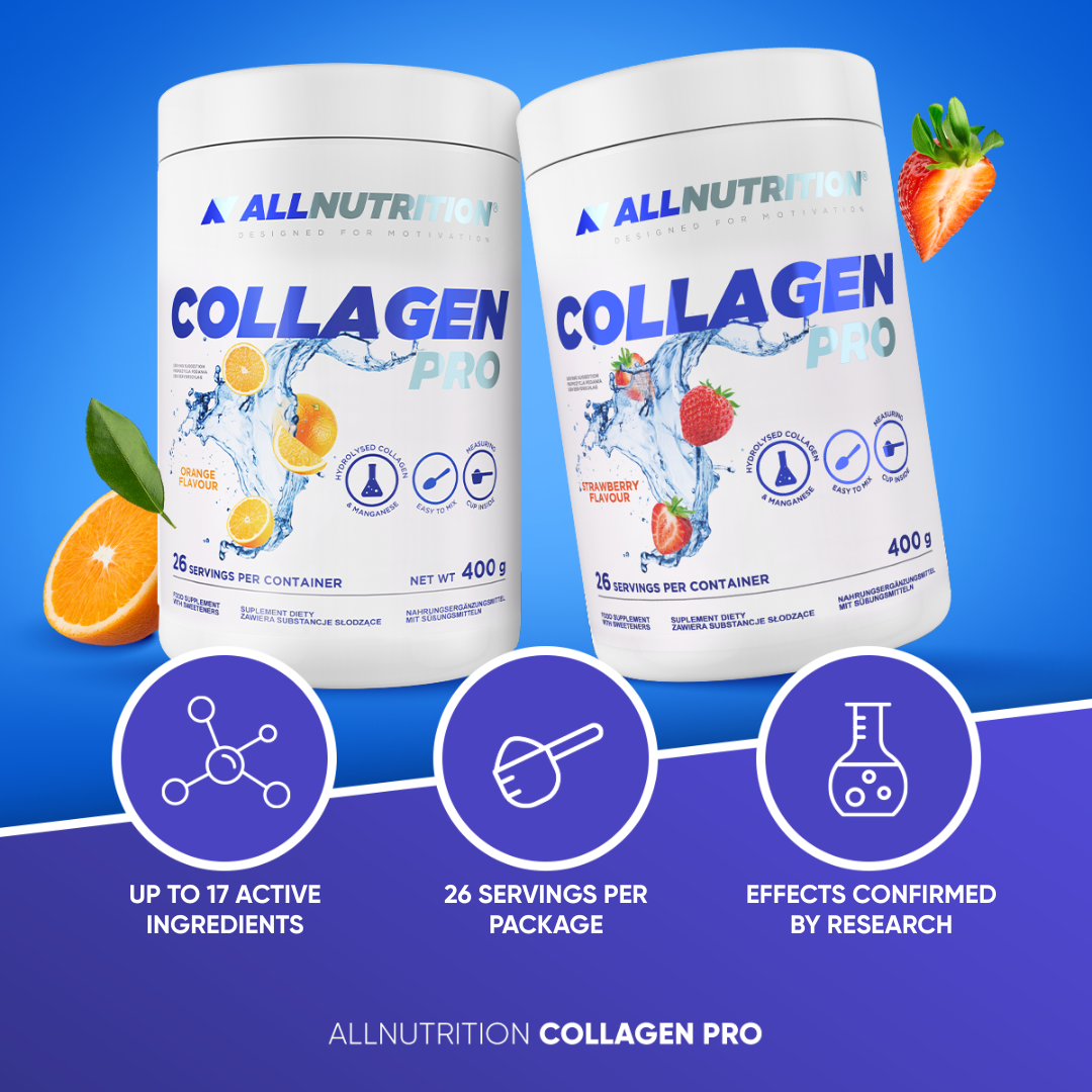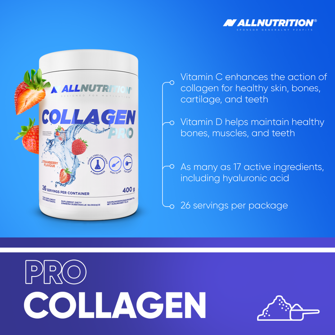 ALLNUTRITION COLLAGEN PRO is a dietary supplement that provides hydrolysed collagen in a convenient drinkable form. It contains many valuable and necessary substances. Thanks to the vitamins and minerals it contains, it supports health and the musculoskeletal system.