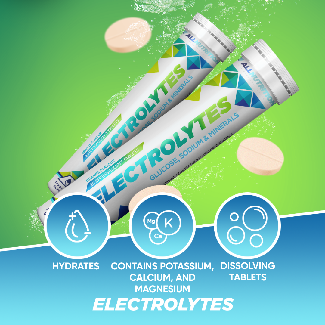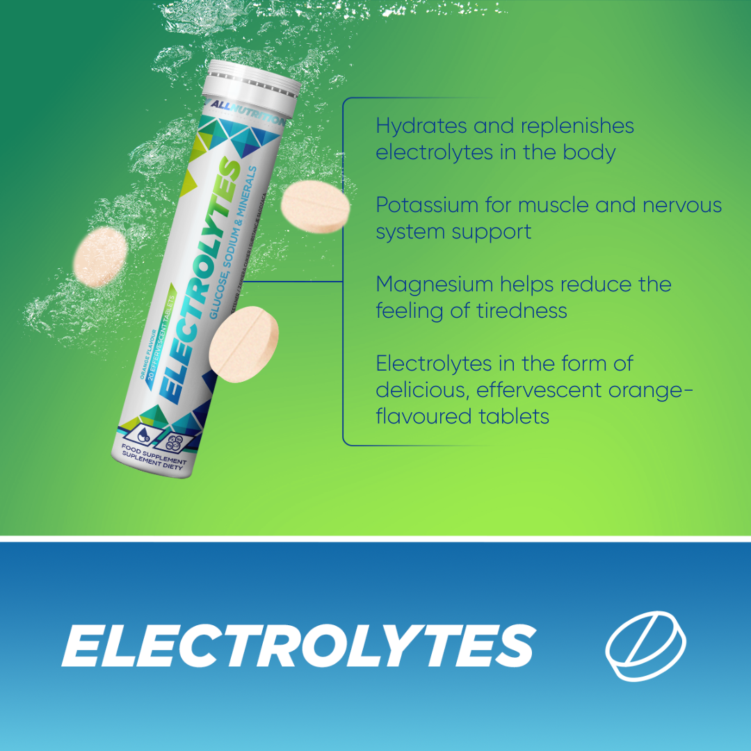 ALLNUTRITION ELECTROLYTES is a modern isotonic drink concentrate in the form of effervescent tablets, intended for use during physical activity, before or immediately after exercise. Its main task is to instantly replenish lost fluids and electrolytes. It also provides energy and functional ingredients that can be used during intense training or as a good remedy for recovering strength after physical exertion.