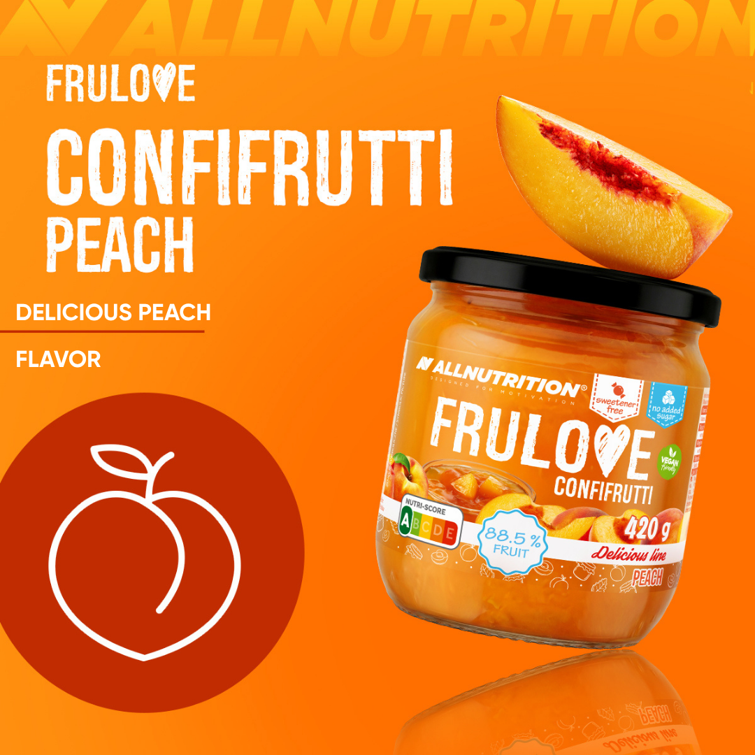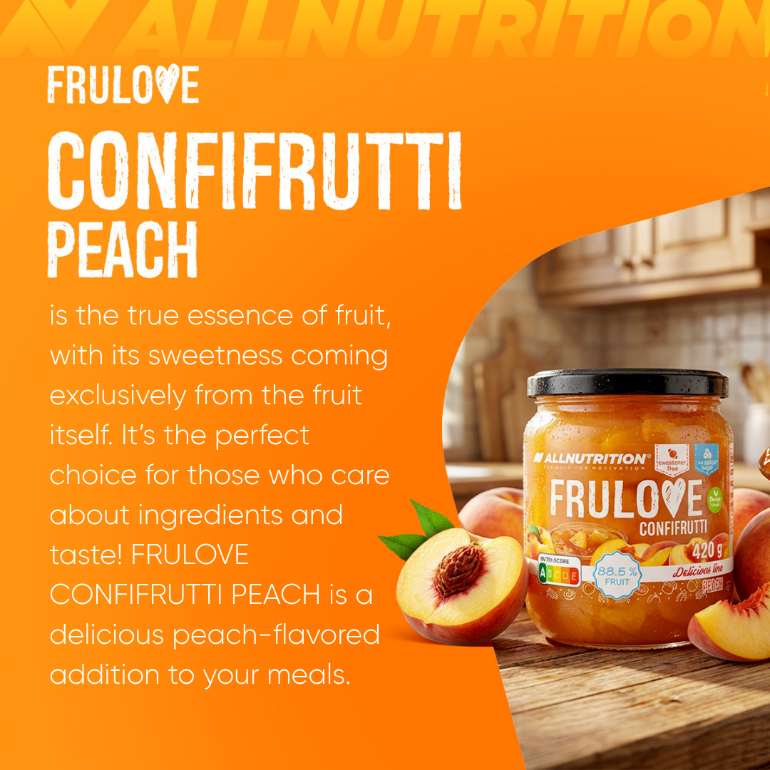 ALLNUTRITION FRULOVE CONFIFRUTTI PEACH is the true essence of fruit, with sweetness coming exclusively from the fruit itself. It is the perfect choice for those who care about ingredients and taste! FRULOVE CONFIFRUTTI PEACH is a delicious peach addition to your meals.
