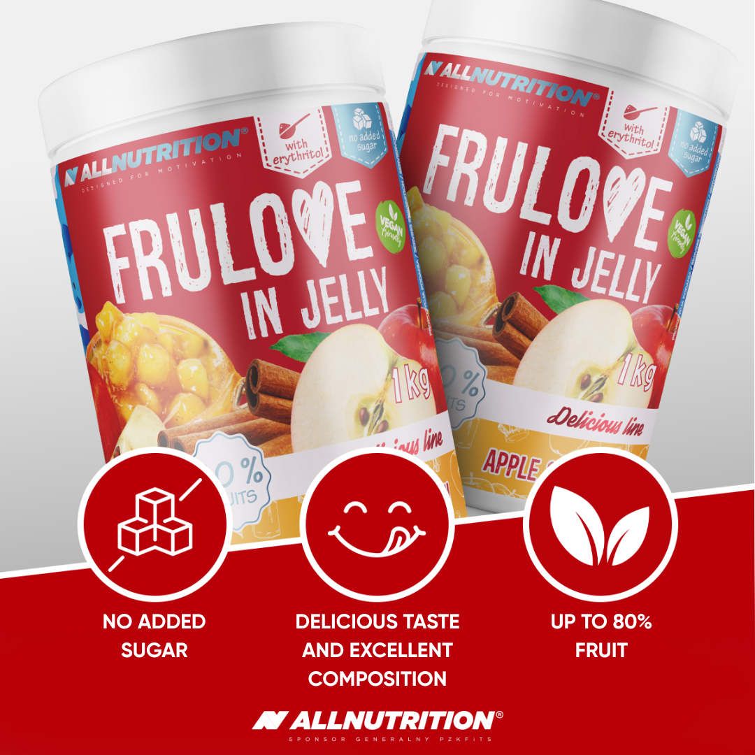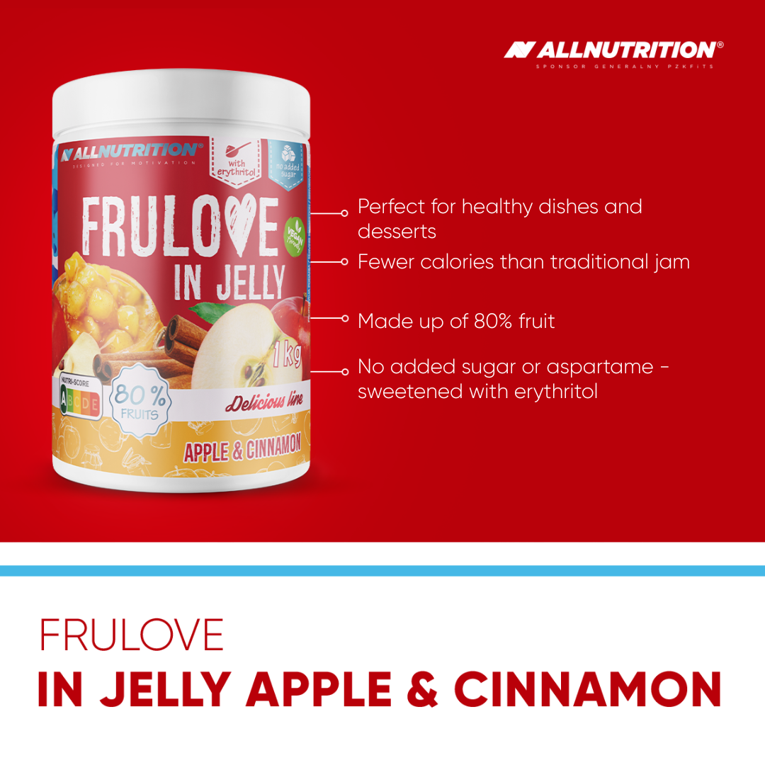ALLNUTRITION FRULOVE IN JELLY APPLE & CINNAMON is a delicious jam without added sugar, with whole apple pieces and up to 80% fruit! Created for those who want to take care of their figure without giving up a little sweet pleasure.