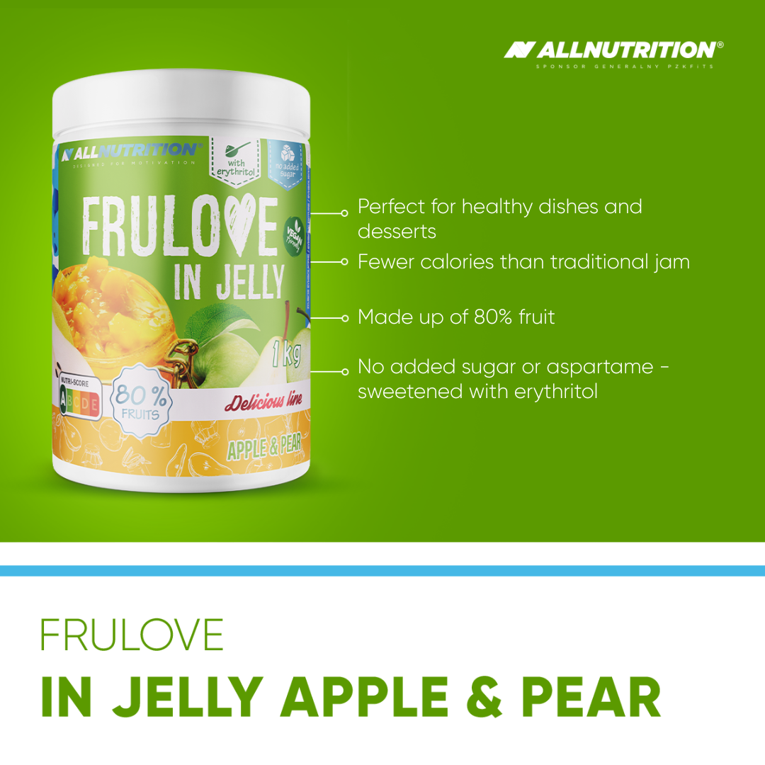 FRULOVE IN JELLY APPLE & PEAR Apple & Pear In Jelly can be used in many different ways. As an addition to waffles and pancakes, ice cream, whipped cream, confectionery masses, pierogi, pasta, rice. All the fruit was fresh and carefully selected before processing.