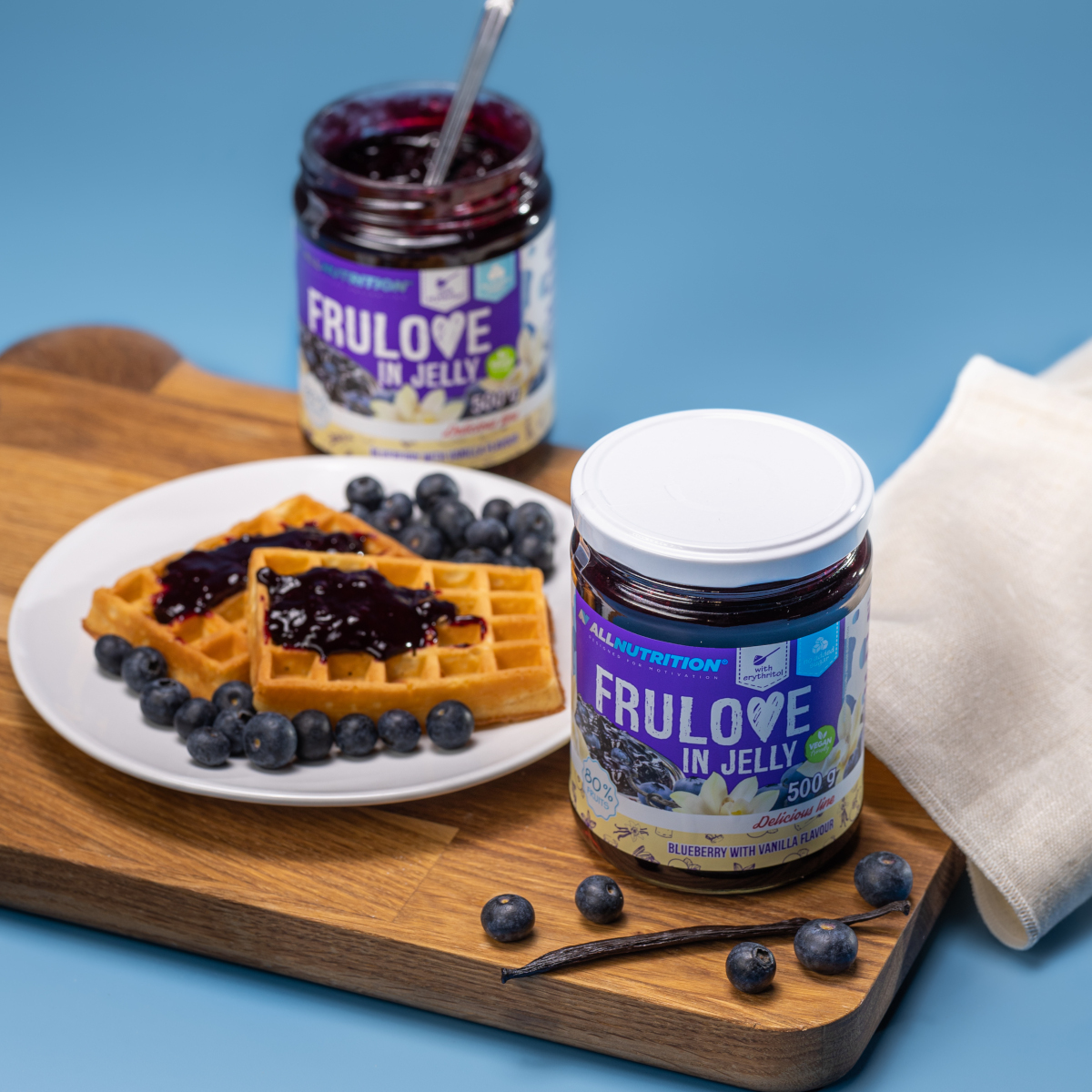 ALLNUTRITION FRULOVE IN JELLY BLUEBERRY WITH VANILLA are blueberries in gel with a hint of vanilla. Frulove Blueberry With Vanilla has a light texture, slightly similar to kissel, in which we submerged whole blueberries. Our thick jelly is made only from the highest-quality fruit.