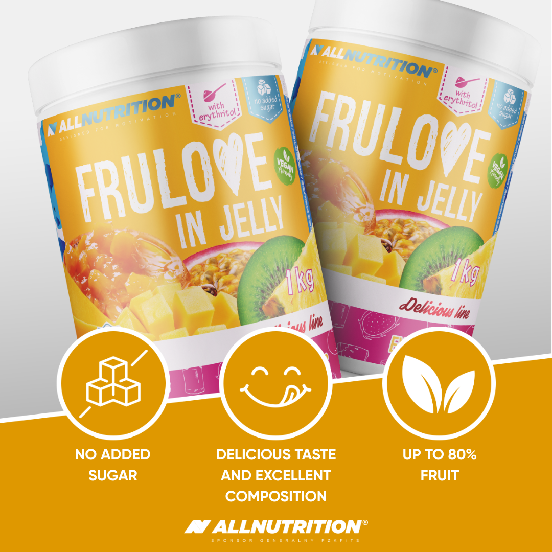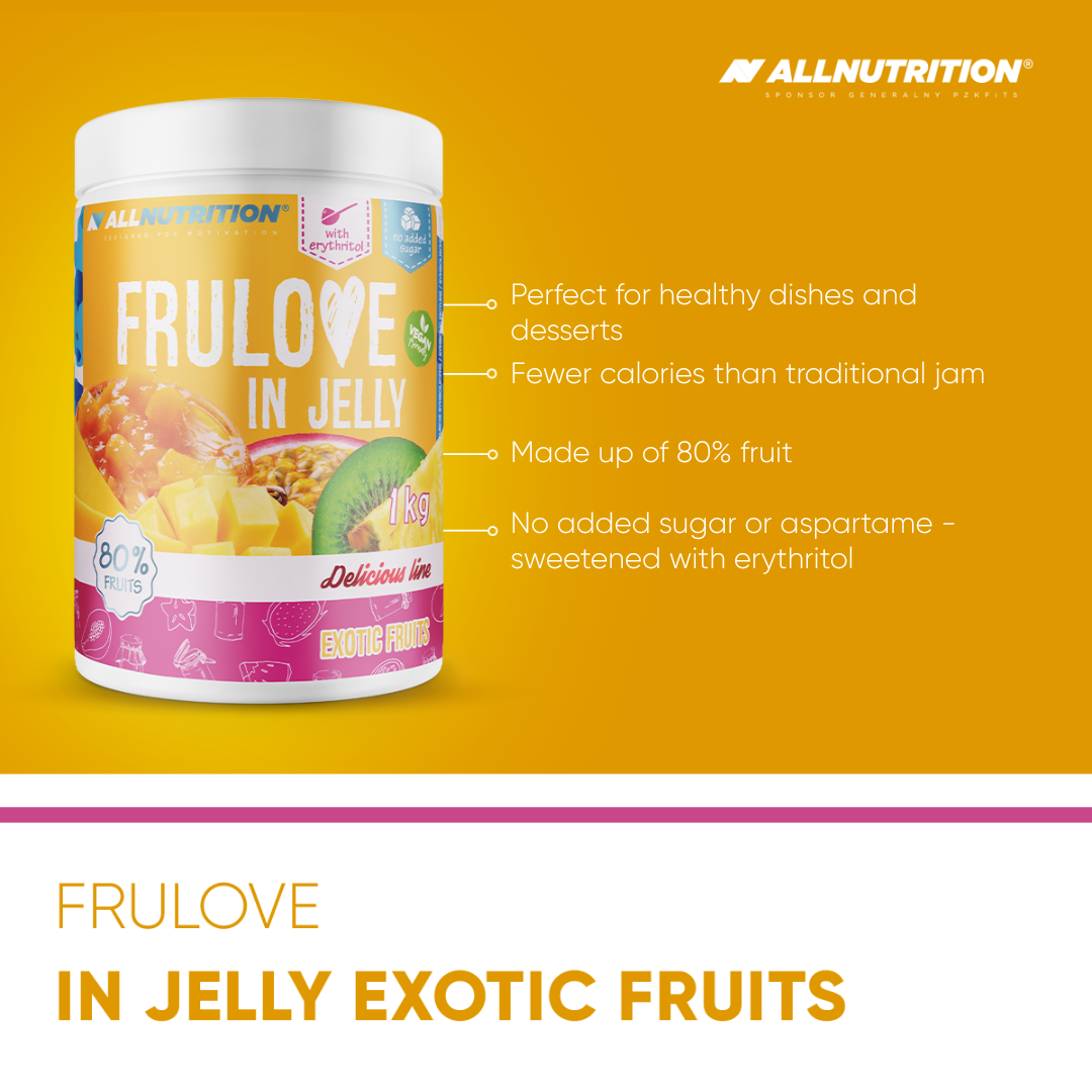 ALLNUTRITION FRULOVE IN JELLY EXOTIC FRUITS is a delicious sugar-free jam with whole pieces of fruit – 80% fruit content! Created for all those who want to take care of their figure without giving up a little sweet pleasure in their diet.