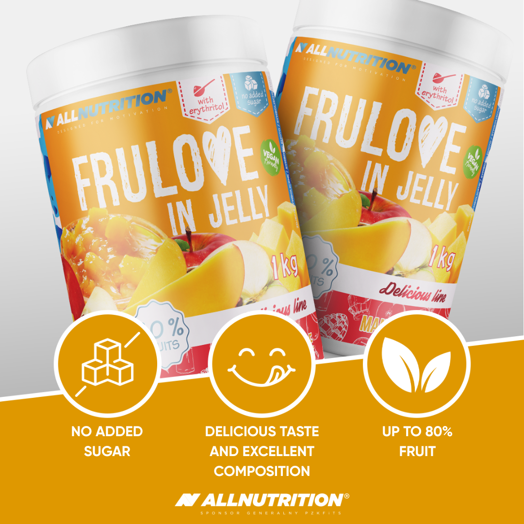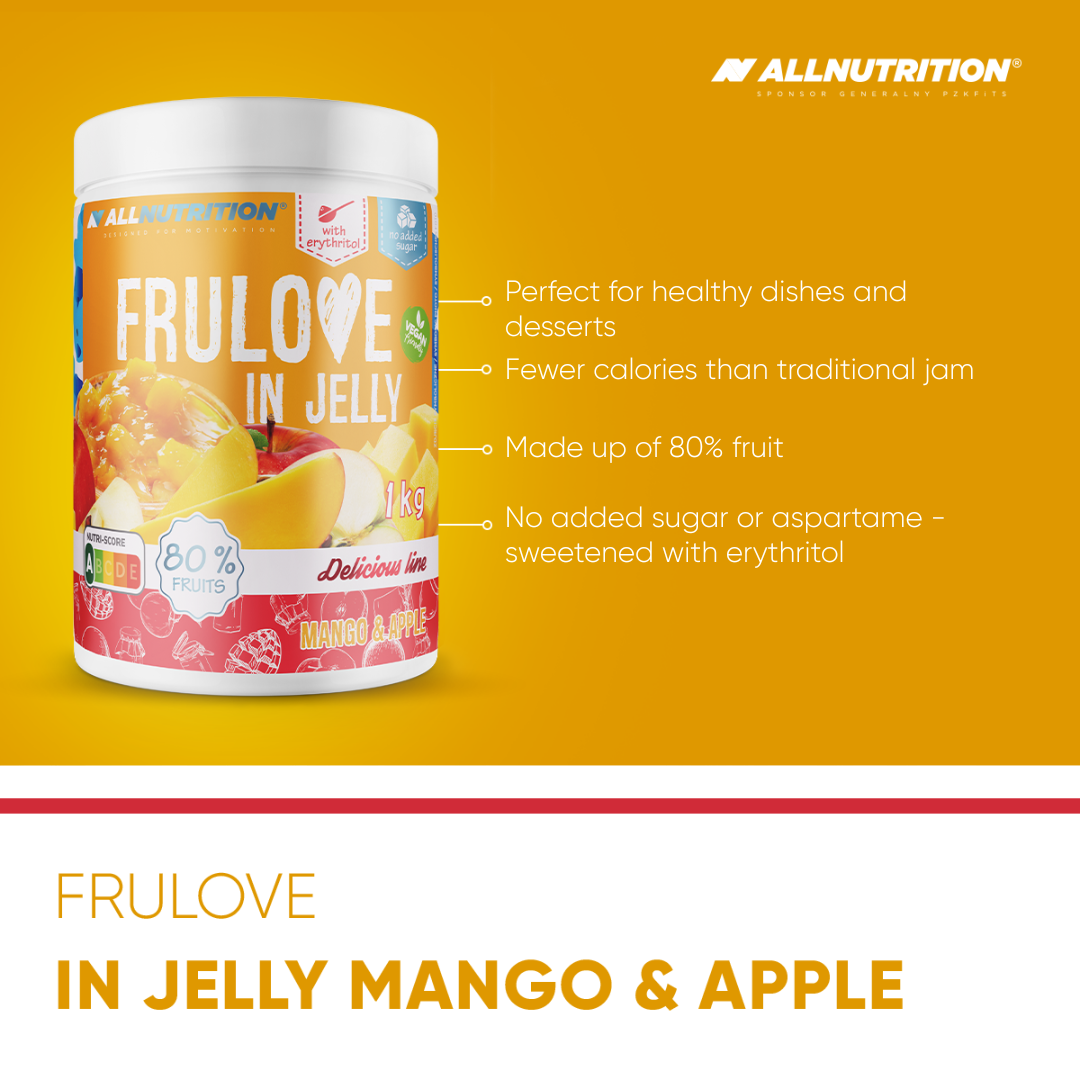 ALLNUTRITION FRULOVE In Jelly Mango & Apple is a delicious jam with no added sugar with whole pieces of apple and mango, up to 80% fruit content! Created for all those who want to take care of their figure while not giving up a little sweet pleasure in their diet.