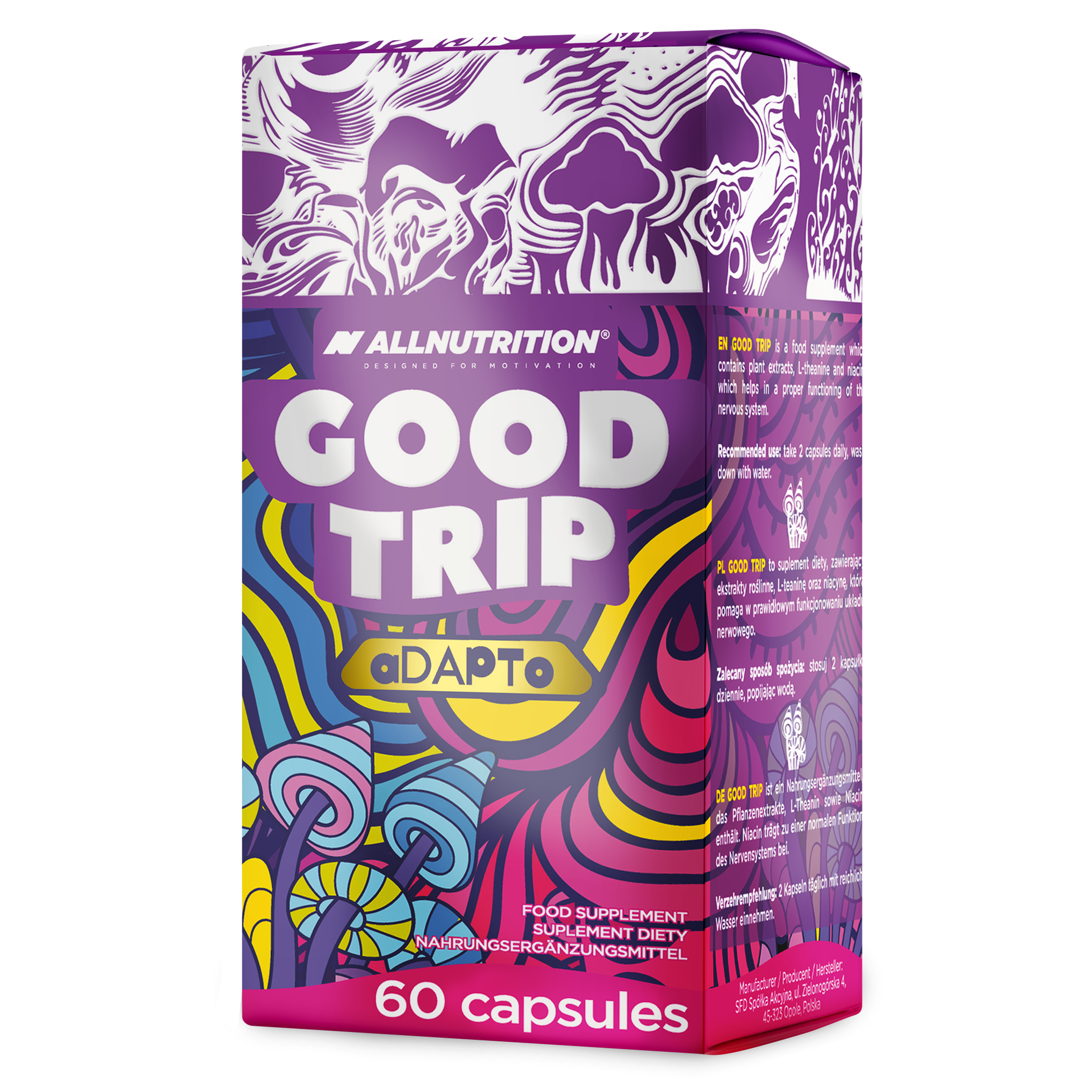 ALLNUTRITION GOOD TRIP is a dietary supplement containing plant extracts, L-theanine, and niacin, which contributes to the proper functioning of the nervous system and helps reduce fatigue and tiredness. It also supports normal psychological functions [1].