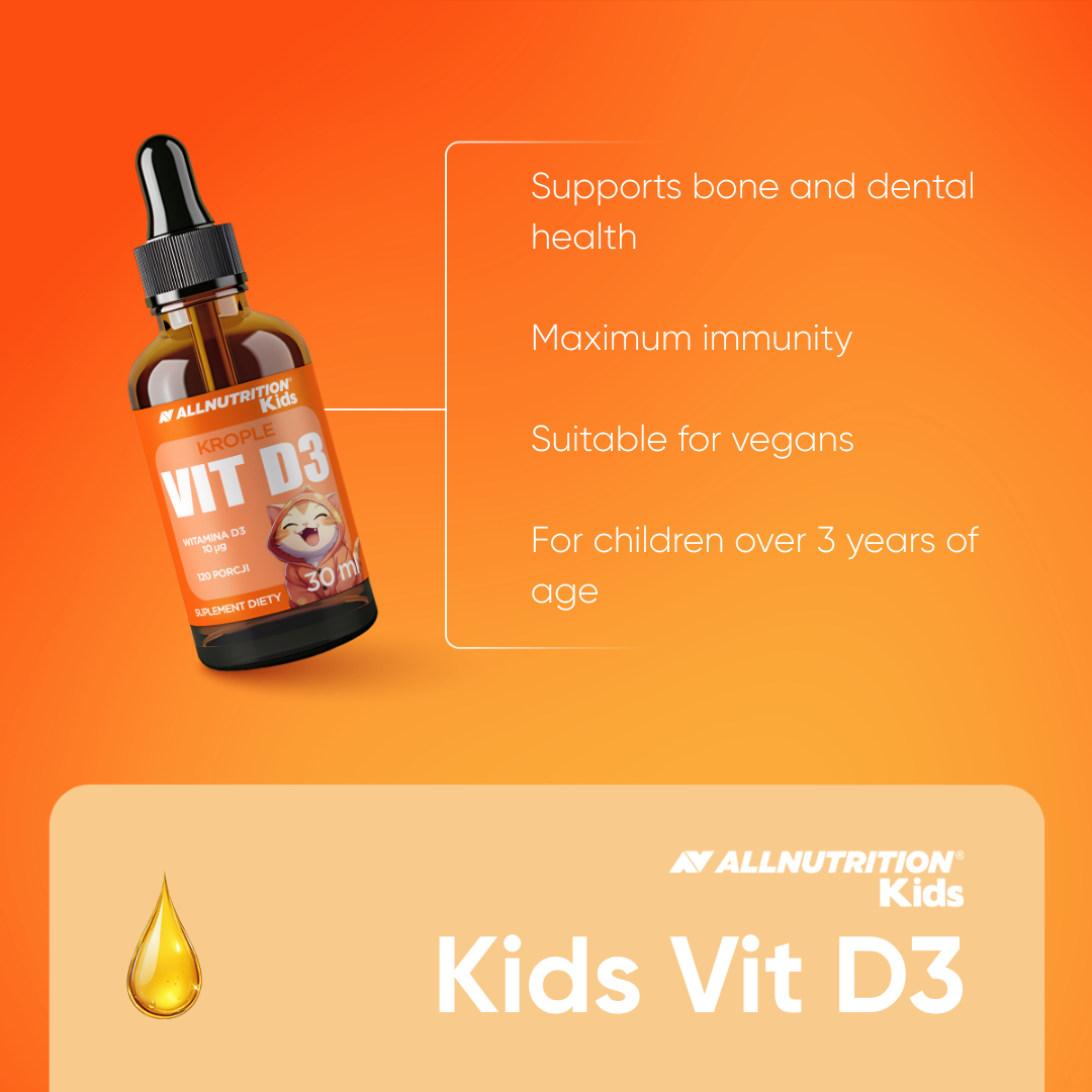 The health and proper development of a child is every parent's priority! ALLNUTRITION KIDS VIT D3 is a dietary supplement in drops, created especially for children. It contains vitamin D3, which is essential for strong bones, immunity and proper development of the body. Suitable for children over 3 years of age.