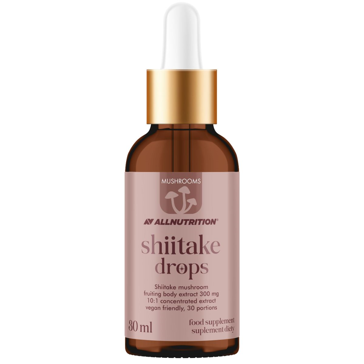 ALLNUTRITION MUSHROOMS SHIITAKE DROPS is a high-quality dietary supplement in drop form, providing an extract from shiitake mushroom, also known as Lentinula edodes. Shiitake is one of the most recognized and valued functional mushrooms worldwide, used for centuries in traditional formulations. It is an ideal choice for active individuals seeking natural ways to enrich their diet with plant-based ingredients.
