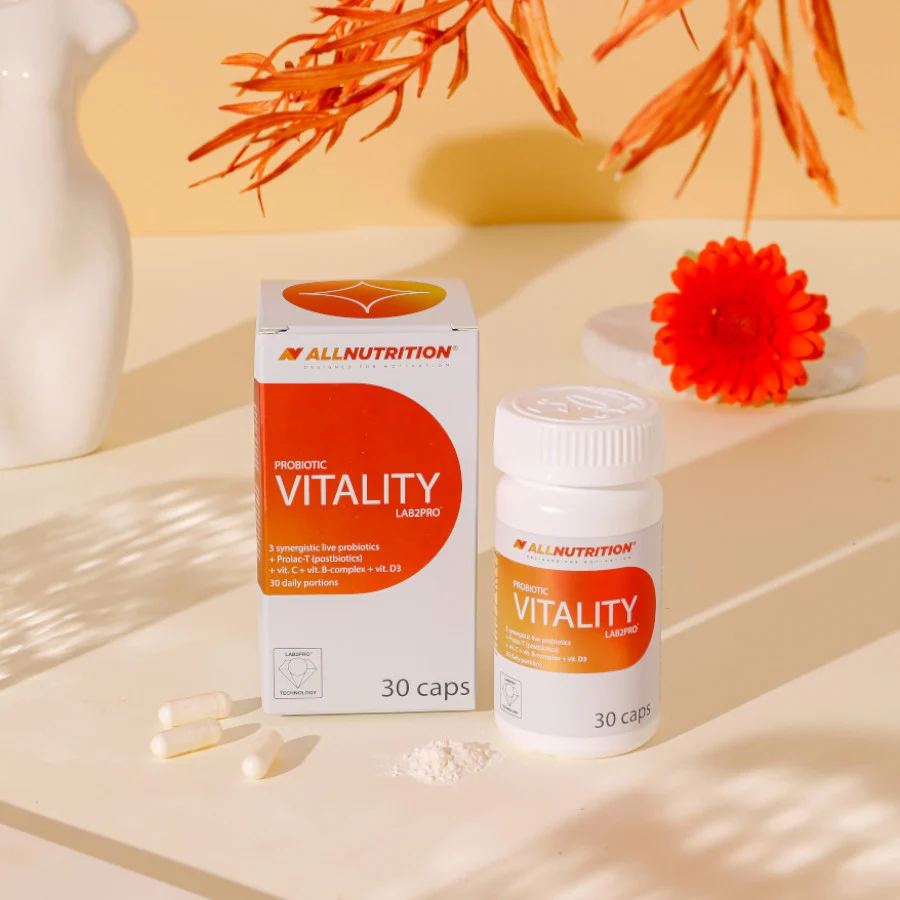ALLNUTRITION PROBIOTIC VITALITY is a probiotic that combines 6 types of vitamins to support energy metabolism and immunity, as well as 3 species of probiotics. It has been enriched with additional strains of the branded LAB2PRO™ and PROLAC-T™ formulas.