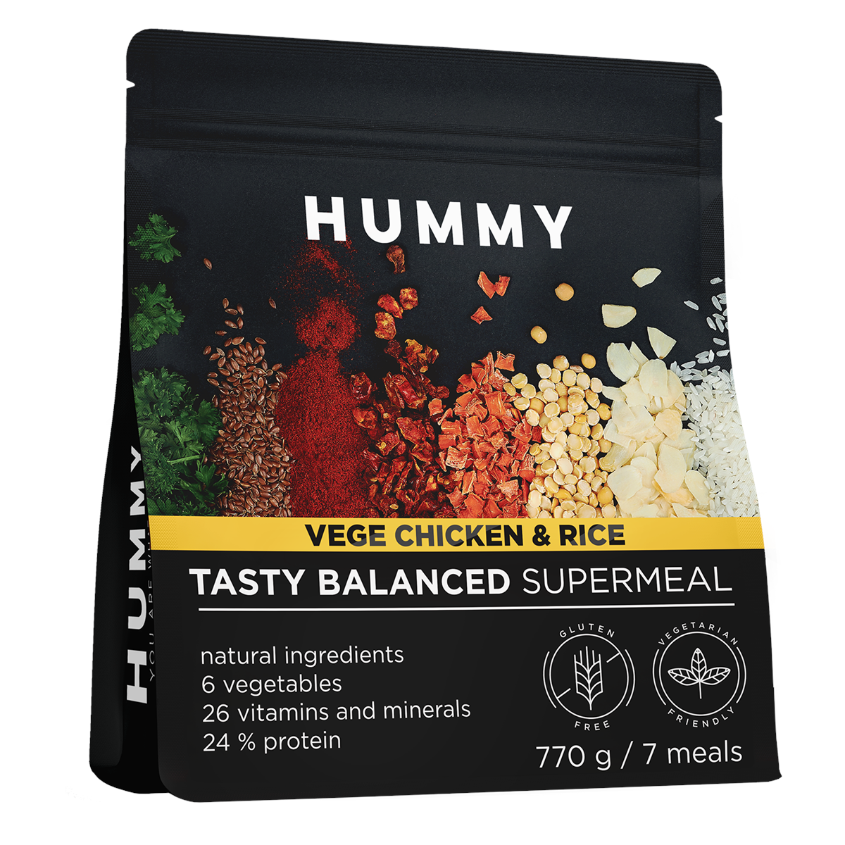 All you need is hot water and a spoon. Boil the water for 2-4 minutes, then pour it over the HUMMY, ready-to-eat meal, mix well, cover or close it, and in another 6 minutes, your meal will be ready. It's perfect for travel or at work, where you can't afford a longer break. Once you've tried all the warm HUMMY BALANCED SUPERMEAL flavours, you'll give up on any time-saving products or dishes that harm your health.
