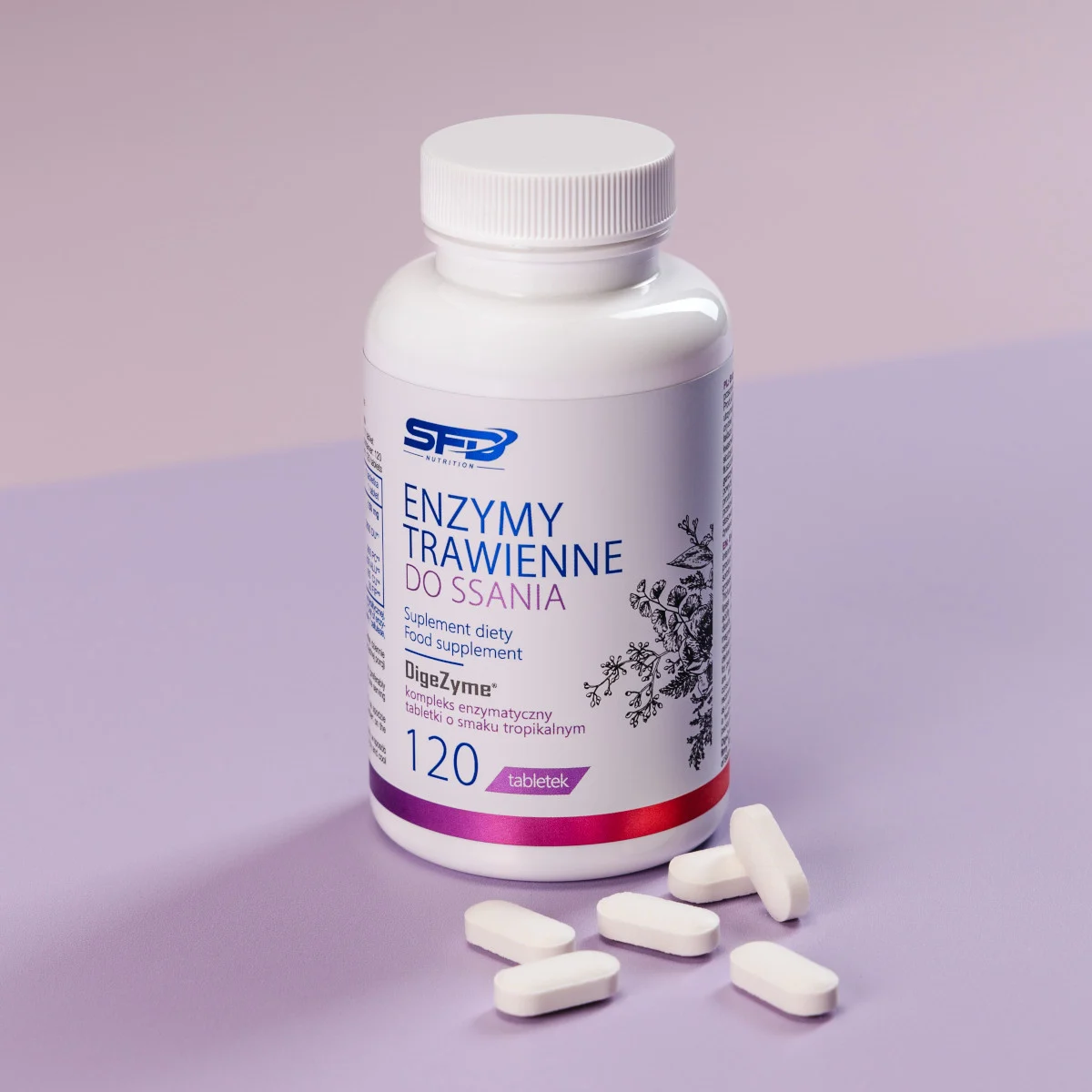 SFD DIGESTIVE ENZYMES is a high-quality mixture in the form of lozenges containing the patented DigeZyme®. enzyme complex. It helps in the effective digestion of food, supports intestinal function and contributes to better absorption of nutrients by the body. Additionally, by supporting the digestive process, the enzymes can improve body weight management and help maintain a healthy diet.