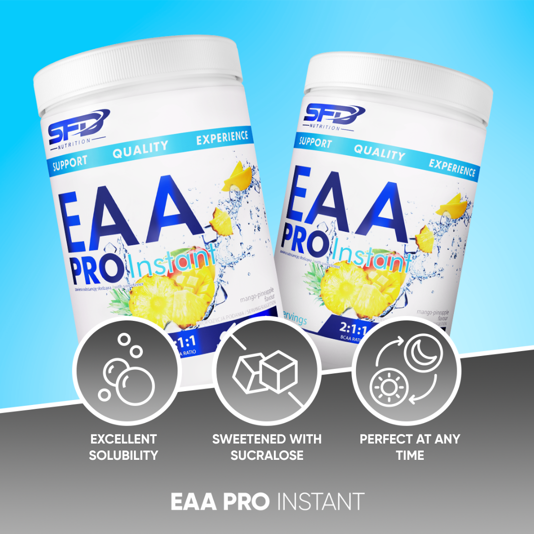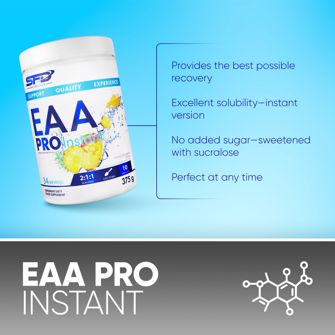 SFD EAA PRO INSTANT A dietary supplement containing all essential amino acids (EAAs), i.e. those that the body cannot synthesise itself and must obtain from external sources. The composition includes: histidine, isoleucine, leucine, valine, lysine, methionine, phenylalanine, threonine, tryptophan, and additionally arginine.