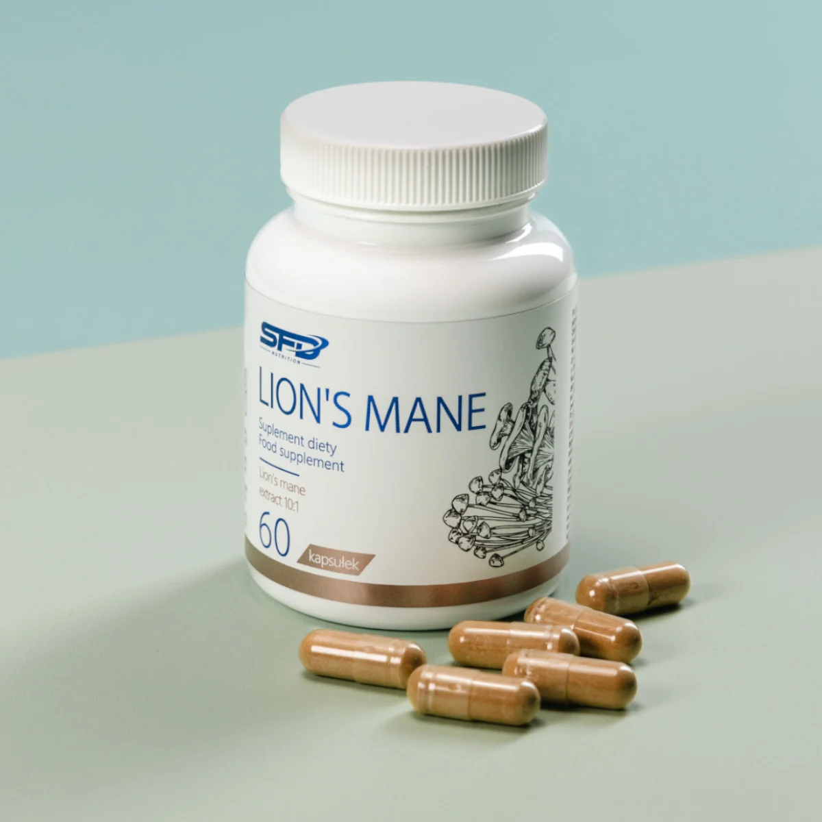 extract from the fruiting bodies of the coneflower hericium erinaceus, capsule shell (gelatine), starch, anti-caking agents: magnesium salts of fatty acids, silicon dioxide