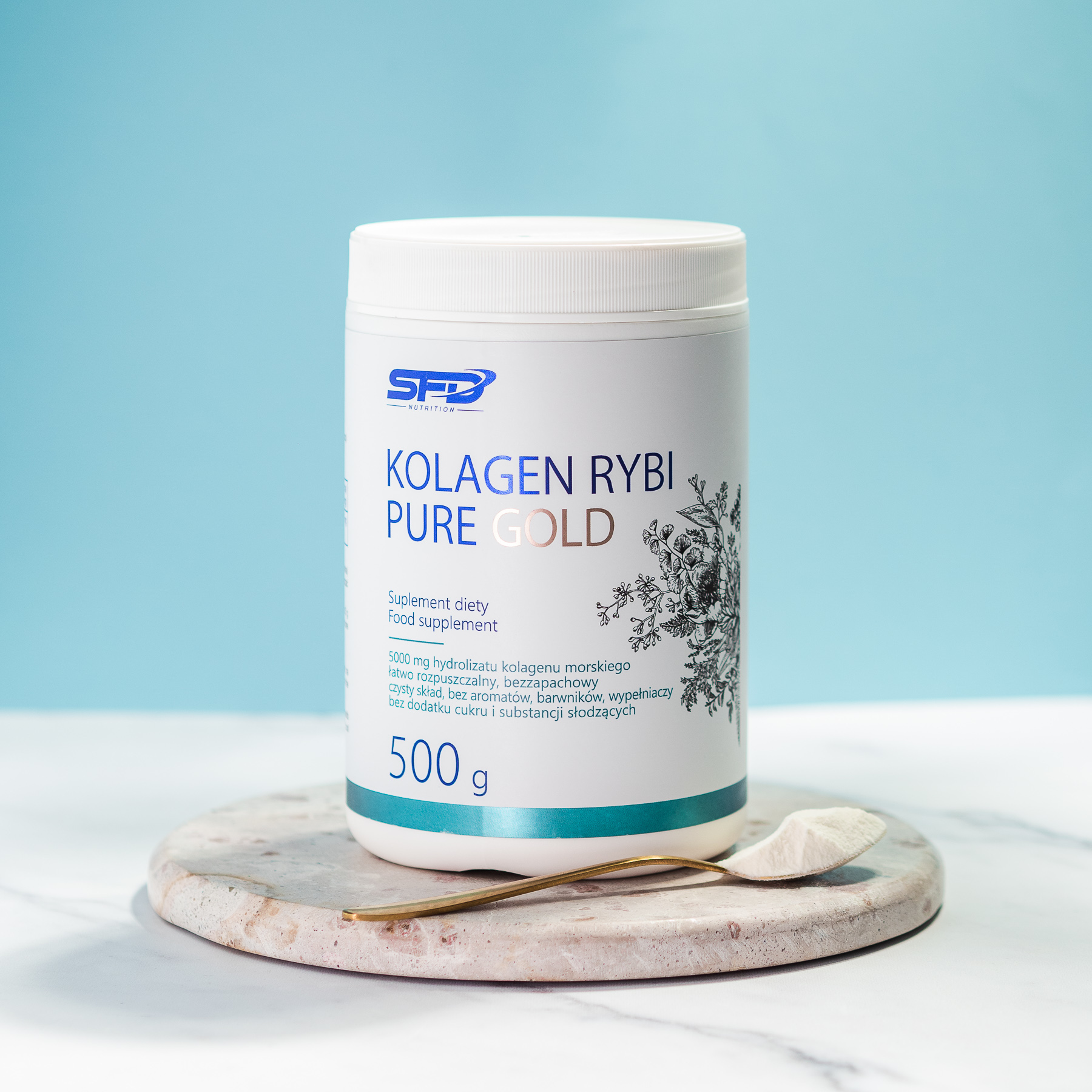 SFD FISH COLLAGEN PURE GOLD is a powdered dietary supplement based on hydrolysed fish collagen, dedicated to people who care about the healthy appearance of their skin, as well as to people who play sports, after sports injuries, during the recovery period. The product consists of 100% hydrolysed collagen, without unnecessary additives, sugar or fillers.