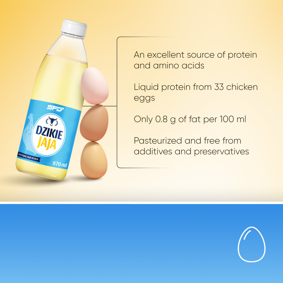 SFD WILD EGGS offer a convenient way to supply high-quality egg protein, including essential amino acids. This product was created for individuals who want to enrich their diet with low-fat protein sources while looking for practical culinary solutions. Thanks to the pasteurisation process, WILD EGGS have increased durability and improved resistance to external conditions.